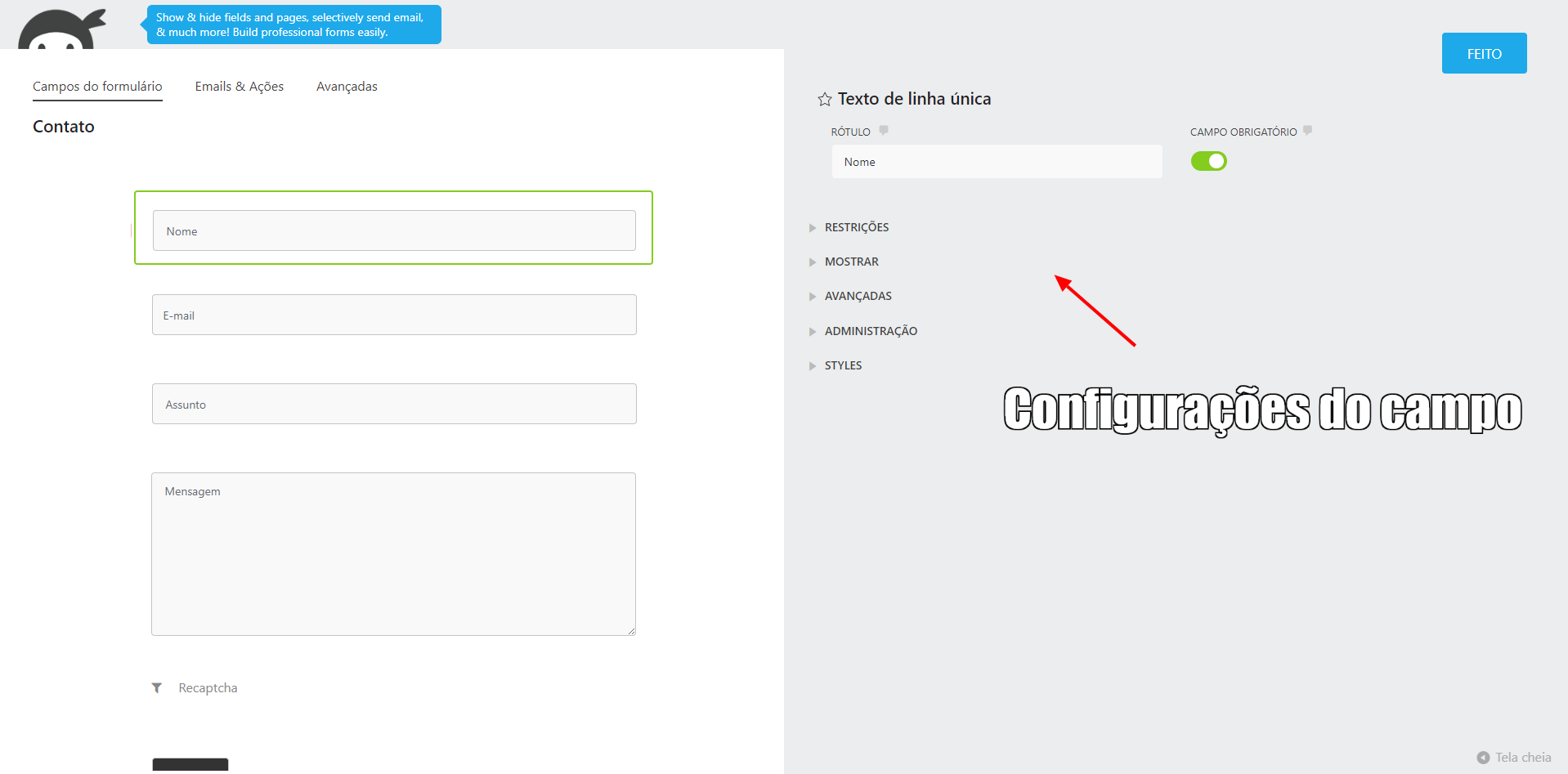 O Ninja Forms oferece uma variedade de campos pré-construídos, como: