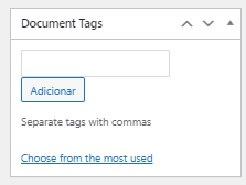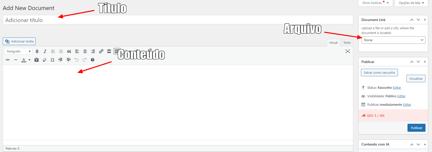 - Upload de arquivo: permite que o documento seja baixado. Você poderá fazer o upload de arquivos como PDFs, DOCs, e outros tipos suportados pelo WordPress.
